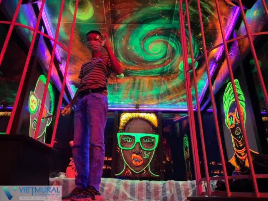bằng sự kết hợp của đèn phản quang, cùng màu vẽ phản quang. tao nên bức tran vô cung huyền ảo. như phát sáng trong đêm
